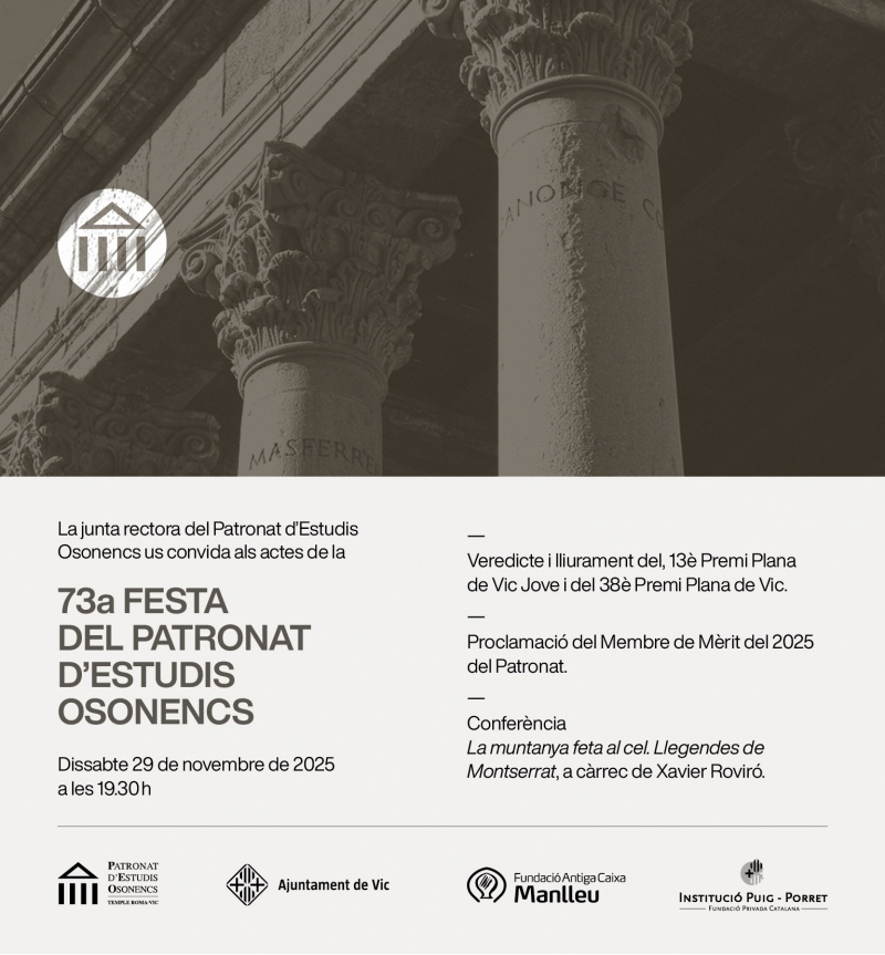 Dissabte 29 de novembre a 2/4 de 8 del vespre al Temple Romà tindrà lloc l'acte acadèmic principal del Patronat d'Estudis Osonencs, la 73a Festa Anual.